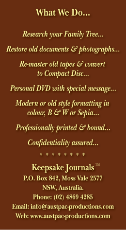 Our latest venture, the Keepsake Family History TM books, are compiled with the greatest care and insight into the value of leaving a record of your life for your children and loved ones to enjoy and hand down to future generations.